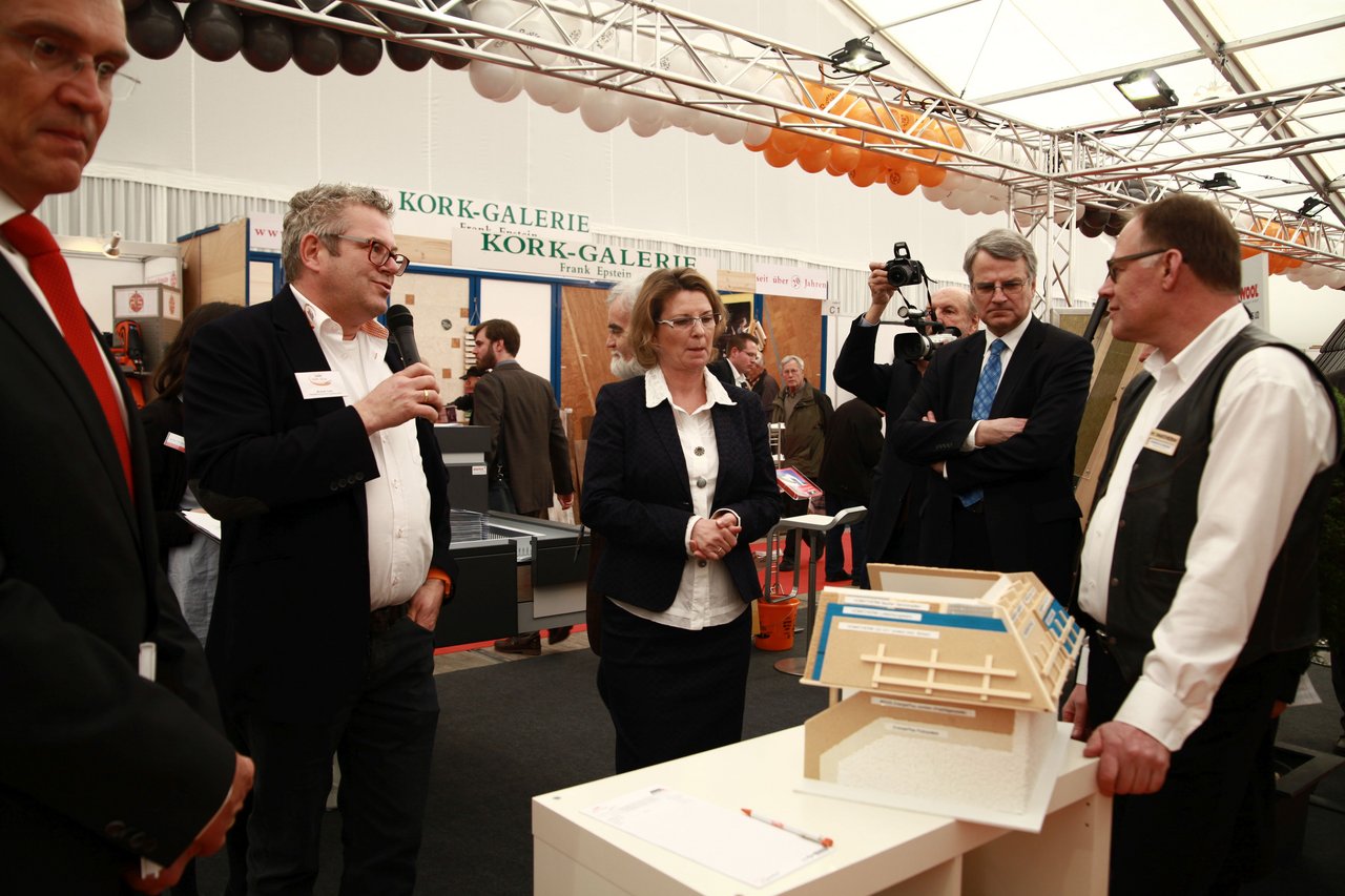 Im Jahr 2014 feierte die Firma Carlé ihr 150-jähriges Bestehen auf der BAUExpo – hier der geschäftsführender Gesellschafter Michael Carlé (links, mit Mikro) im Gespräch mit der hessischen Umweltministerin Priska Hinz. Foto: Messe Giessen