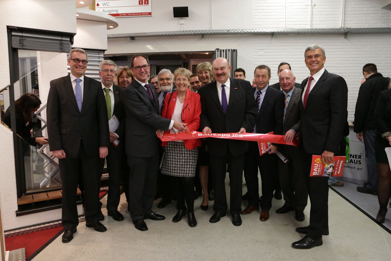 Regierungspräsident Dr. Christoph Ullrich (Dritter von links mit Schere) durchtrennte das Band und eröffnete damit im Beisein geladener Gäste offiziell die BAUExpo 2016.